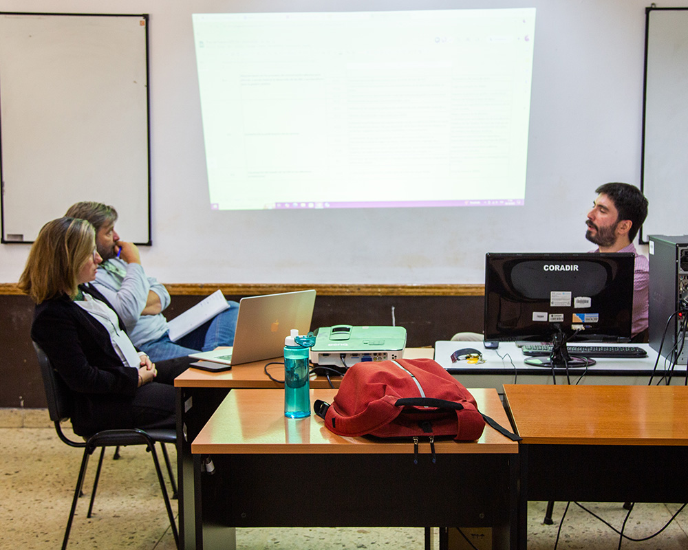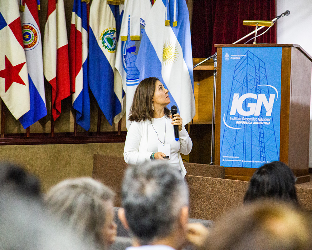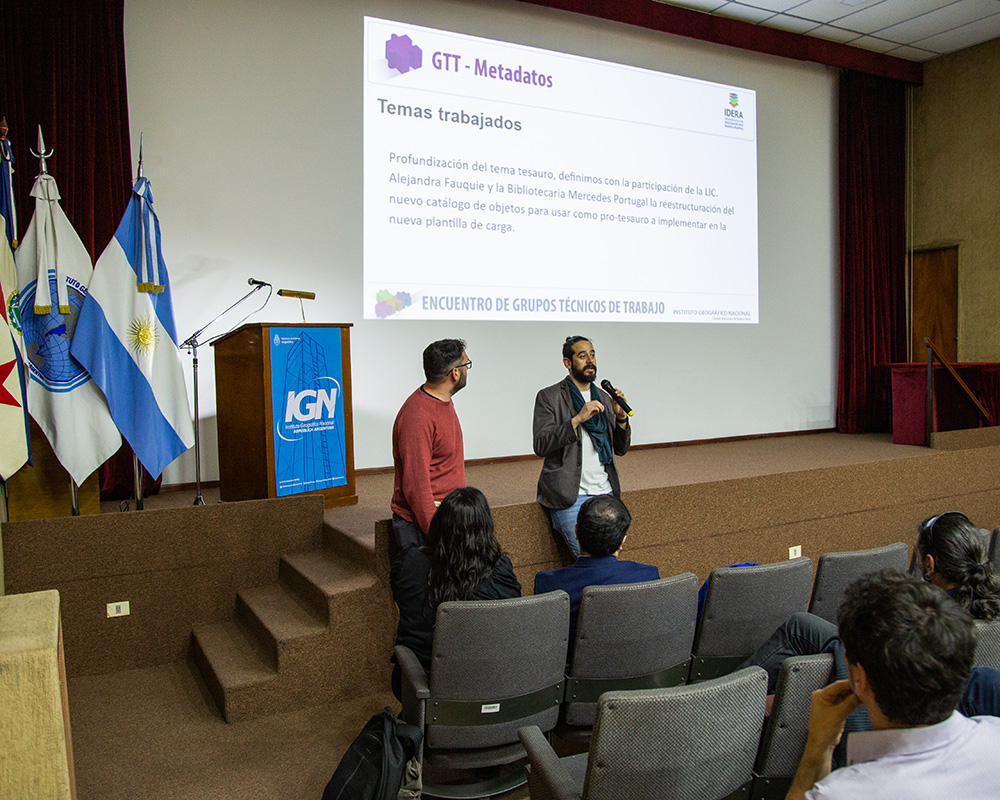 Luego de cinco horas de trabajo, los Grupos Técnicos participaron de una puesta en común en el Microcine del Instituto Geográfico Nacional, donde los coordinadores y coordinadoras de cada equipo expusieron las principales conclusiones del trabajo del día. De esta instancia también participaron como oyentes los representantes del Consejo Directivo de IDERA.